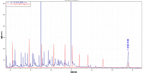 产品的样品TIC图(黑色)与多溴联苯醚混标TIC图(紫色)